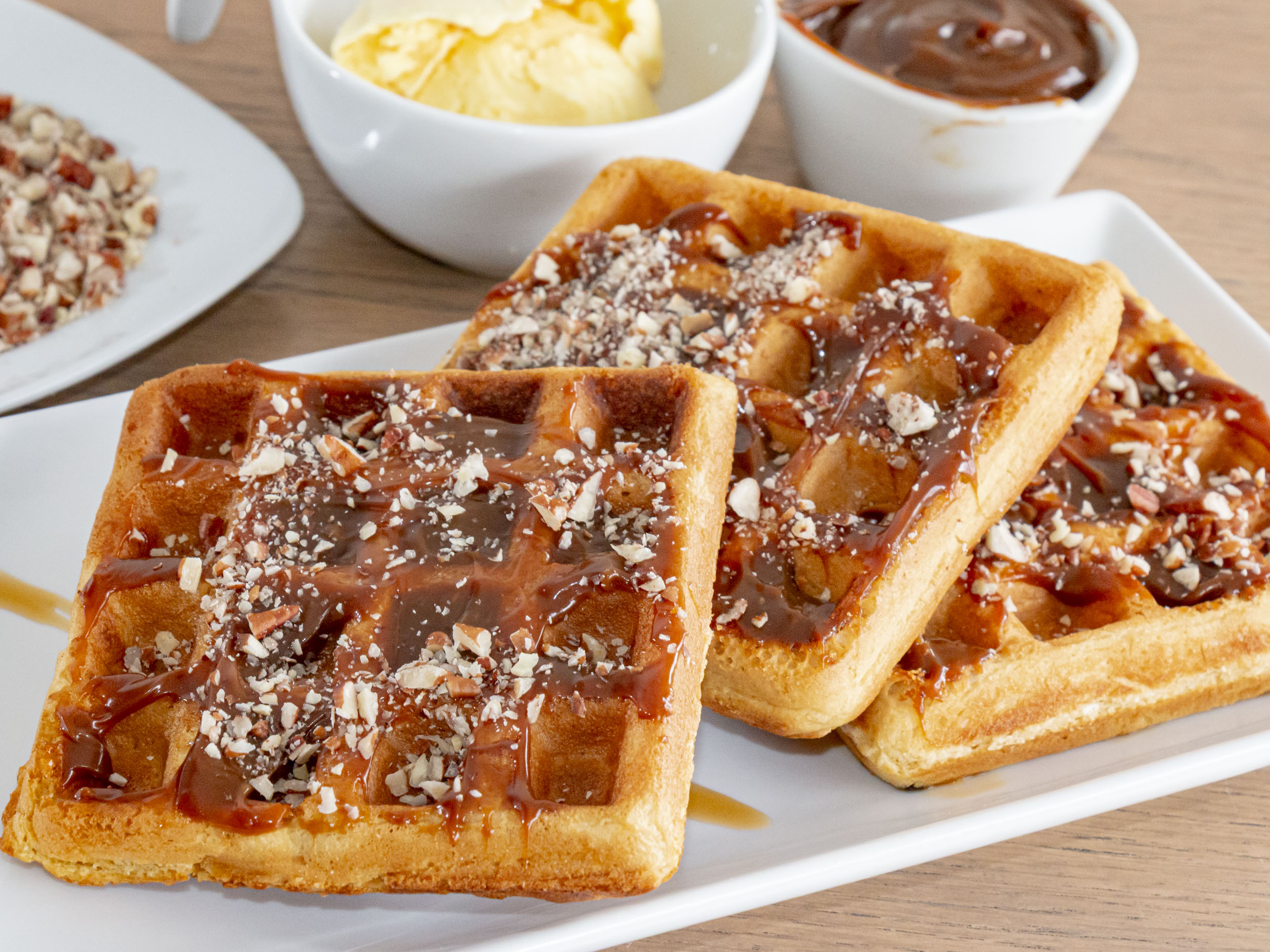 Cuadritos de brownie, helado de vainilla, crema batida, chispas de chocolate, nuez y caramelo.