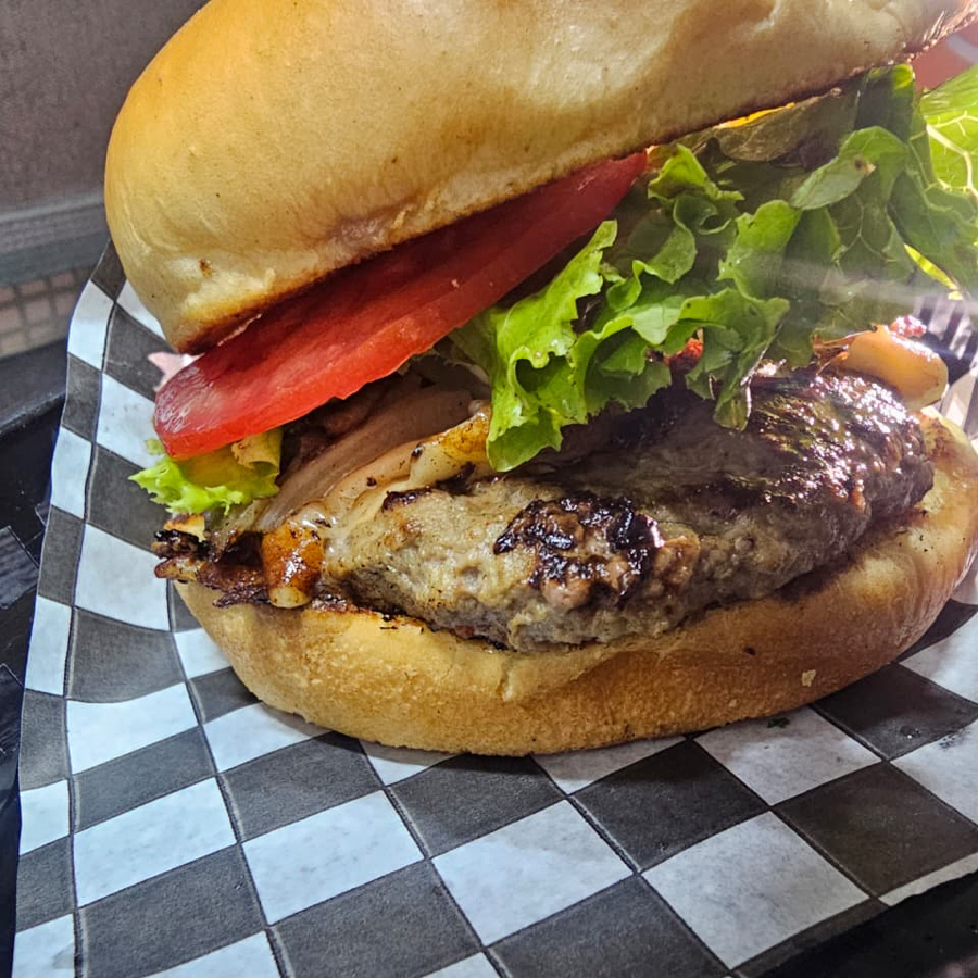 150grs de carne de res casera, costra de mozarella, tocino dorado y verduras.