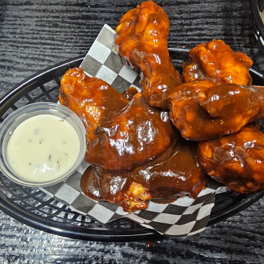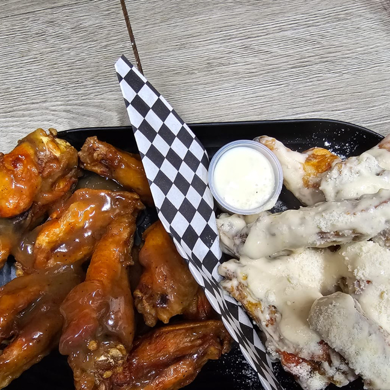 16 Alitas fritas con tu salsa favorita y un dip de aderezo ranch.