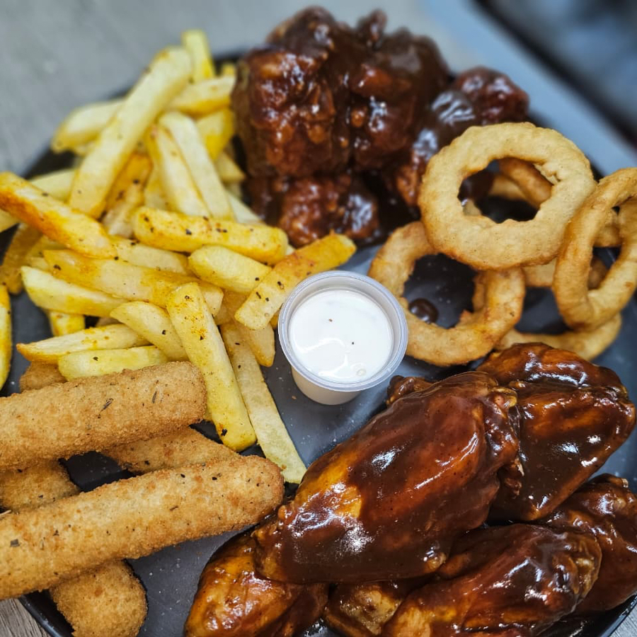 Papas con Queso*1 + 6 Boneless*1 + 6 Aros de Cebolla*1 + 6 alitas*1 + 4 Dedos de Queso*1