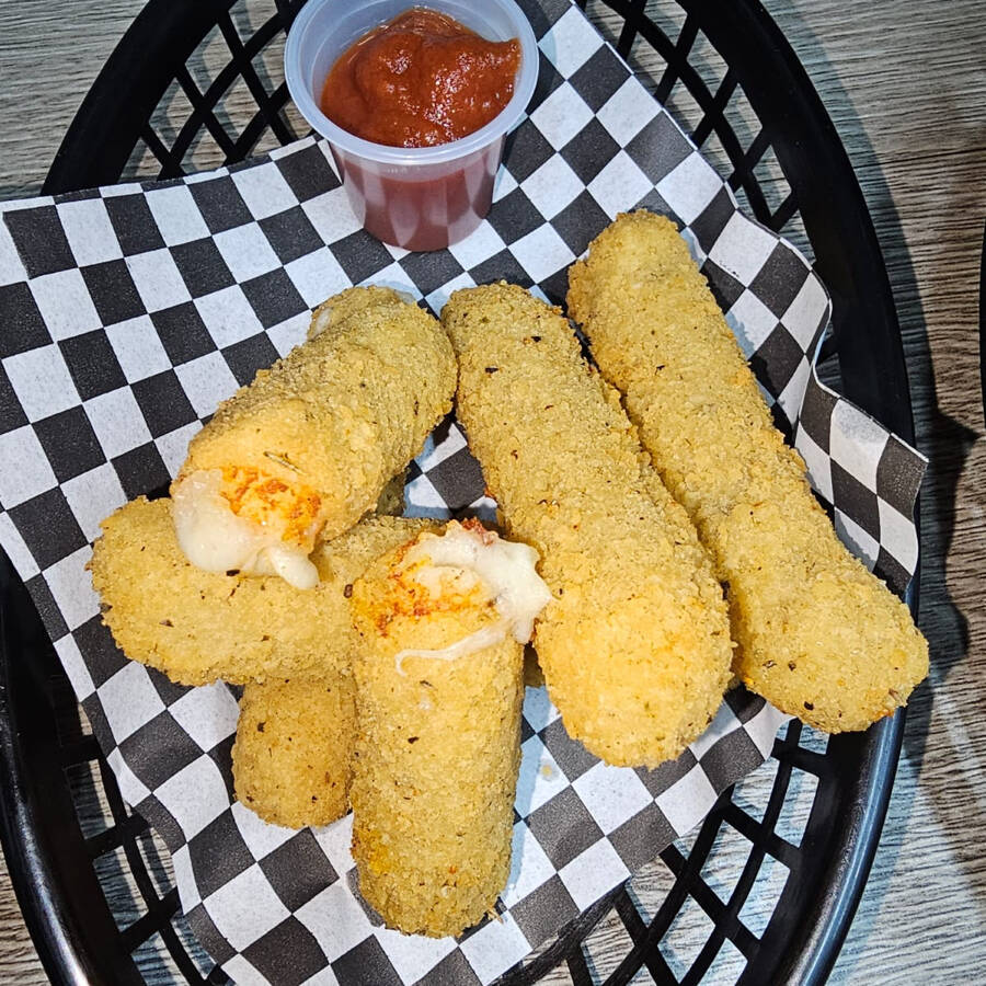Deliciosos bastones de queso mozzarella empanizamos y crujientes, acompañados de salsa de pizza.