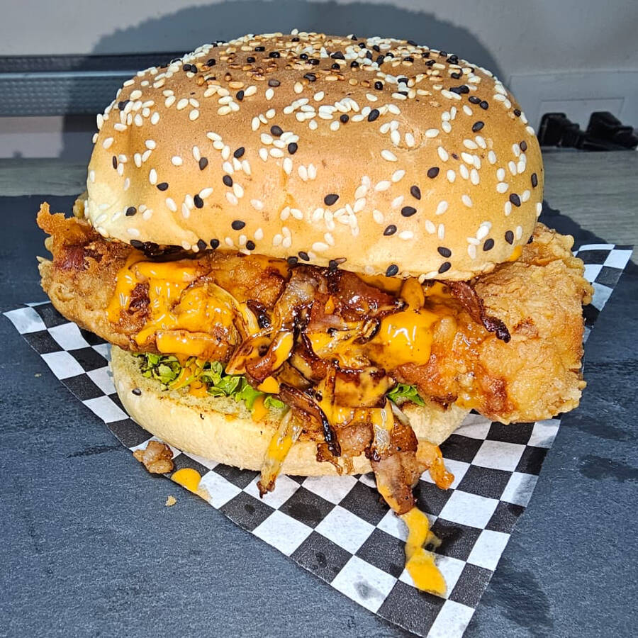 150grs de carne de res casera, doble costra de mozarella, doble queso amarillo y cubierta de queso amarillo derretido con trocitos de tocino dorado.