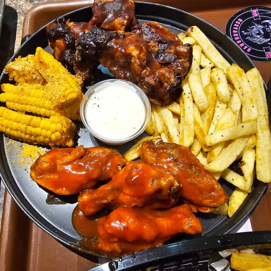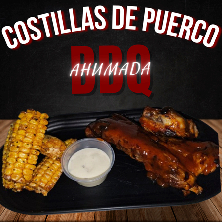 250grs de costilla de puerco bañadas en salsa bbq ahumada, acompañadas con 4pzs de costillas de elote sazonadas y 1 dio de ranch.