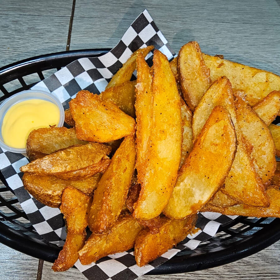 Papas en corte grande con el adobo de la casa y queso amarillo derretido.