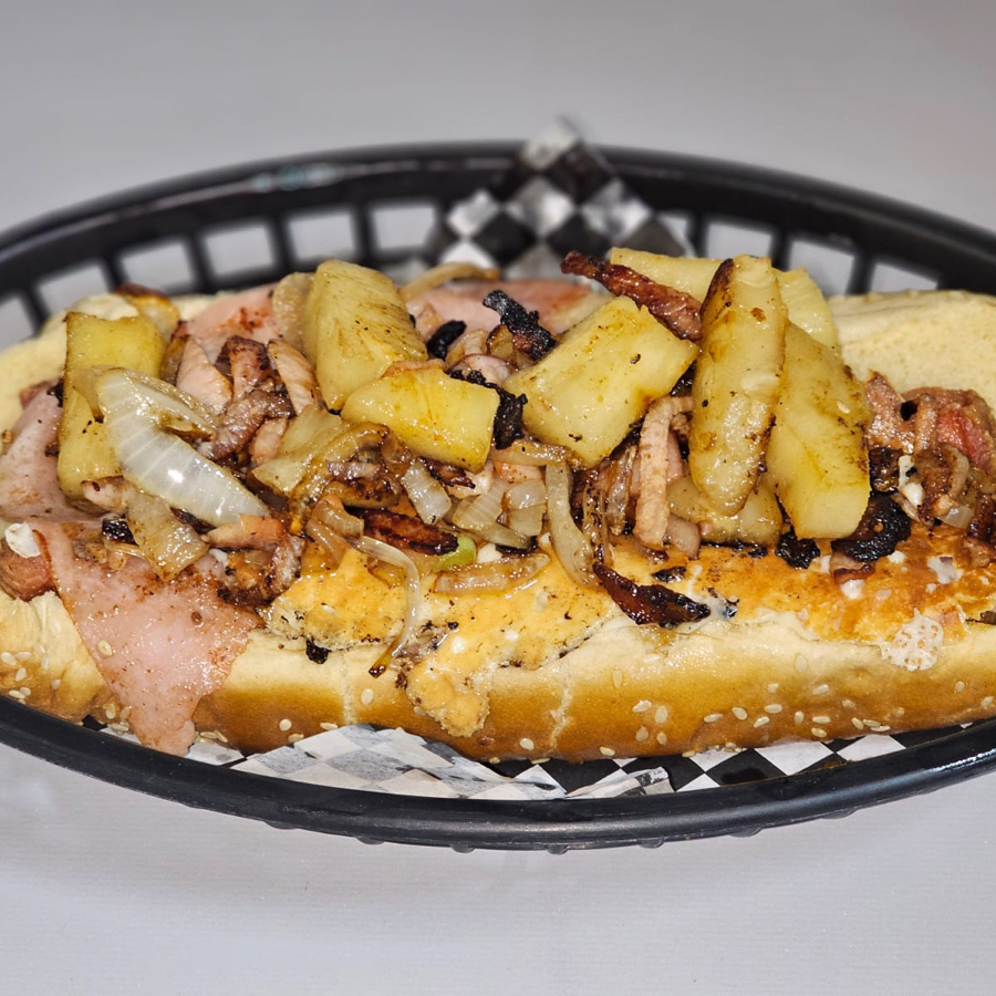 150grs de carne de res casera, costra de mozarella y tocino, jamón, pina asada, salsa mango habanero y verduras.