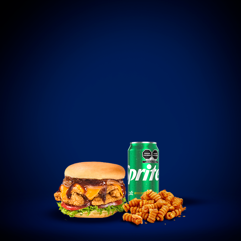 Hamburguesa con queso cheddar, tiras de pechuga de pollo empanizada, vegetales y aderezo BBQ; acompañada de una orden de Papas Twister (150 g aprox) con un chile toreado + 1 Bebida de la familia Coca-Cola®