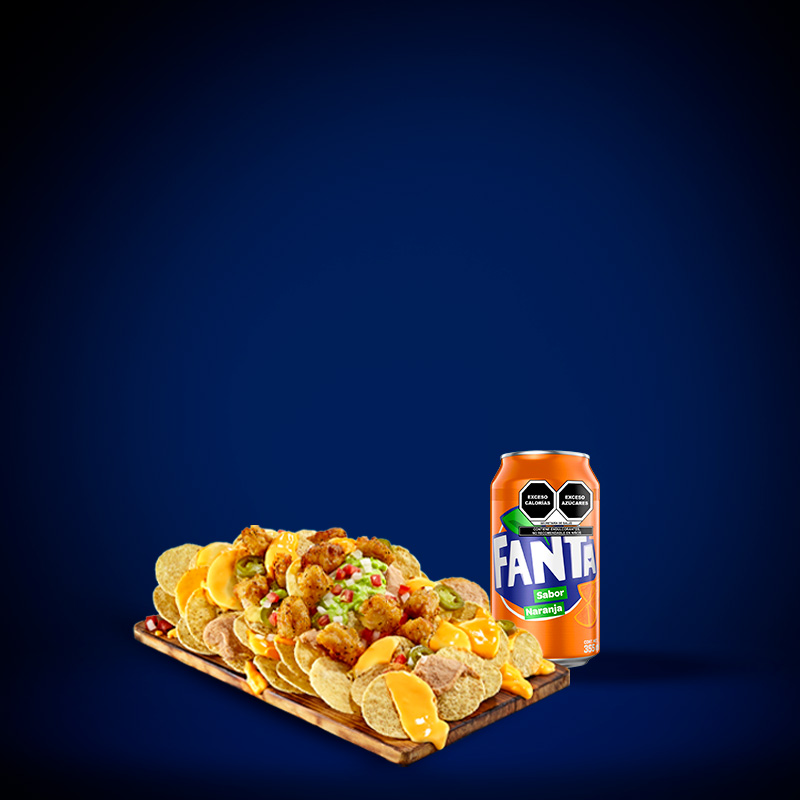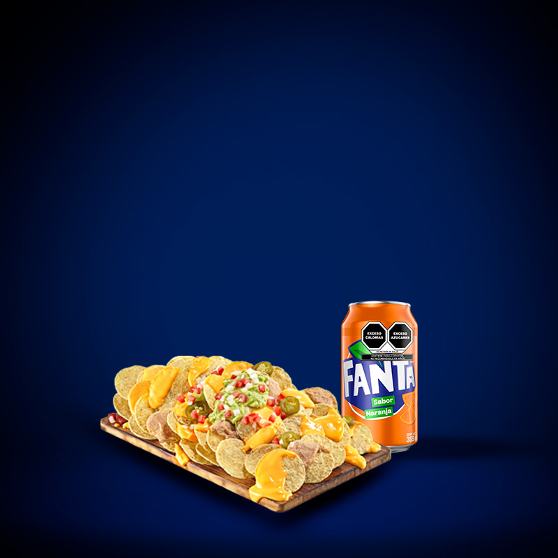 Deliciosos nachos con brisket de res, cubiertos con guacamole fresco, queso para nachos, jalapeños, frijoles y pico de gallo + 1 Bebida de la familia Coca-Cola®