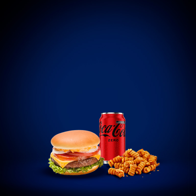 Hamburguesa con queso cheddar, carne de la marca Certified Angus Beef®, vegetales y aderezo; acompañada de una orden de Papas Twister (150g aprox) con un chile toreado + 1 Bebida de la familia Coca-Cola®.