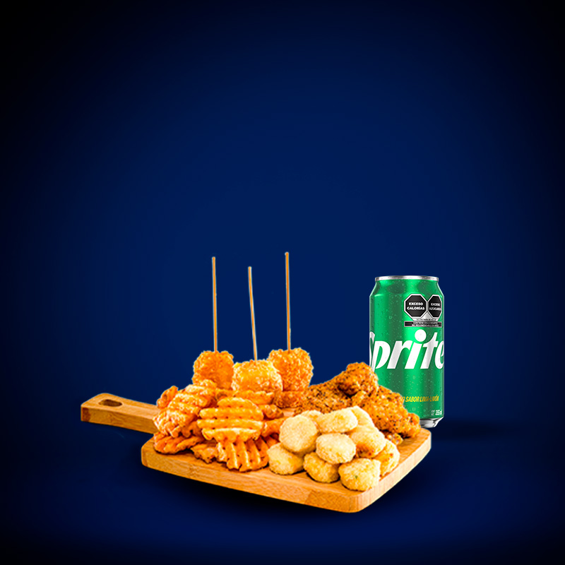 150g Papas Crisscut® + 3 Kushiages de manchego + 200g Jalapeño Pop + 250g Boneless Wings + 1 Bebida de la familia Coca-Cola®. Acompañado con salsa BBQ y salsa Buffalo Wings