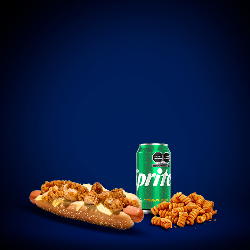 Exquisito hot dog con boneless y queso gouda derretido, acompañado por papas Twister y salsa para boneless de tu elección + 1 Bebida de la familia Coca-Cola®.