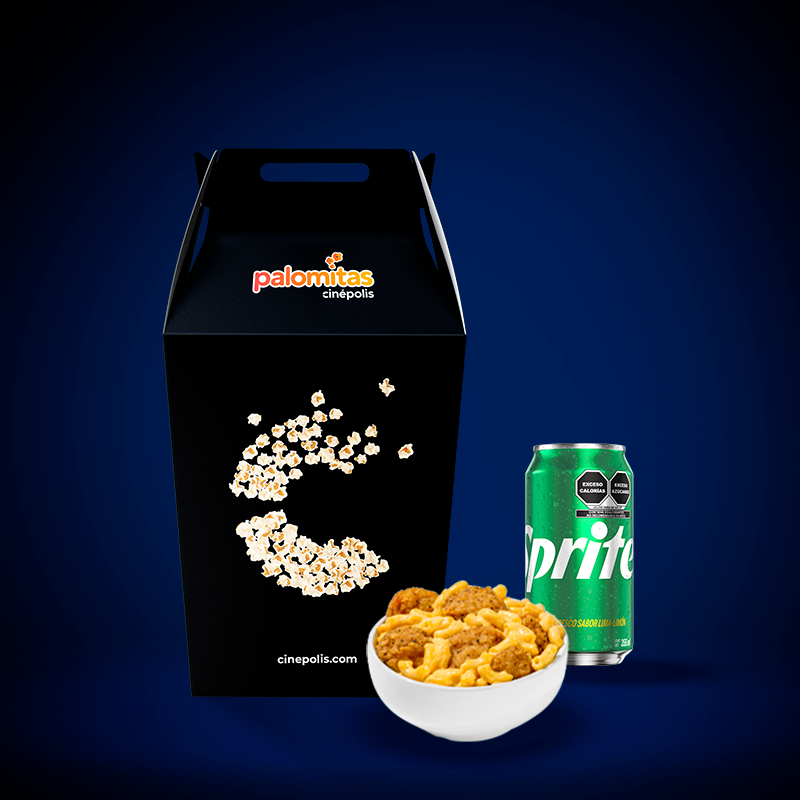 1 Palomitas Cinépolis® P/Llevar + 1 Bebida de la familia Coca-Cola® + 200g aprox. de Boneless de pollo, mezclados con macarrones bañados en salsa de queso cheddar.