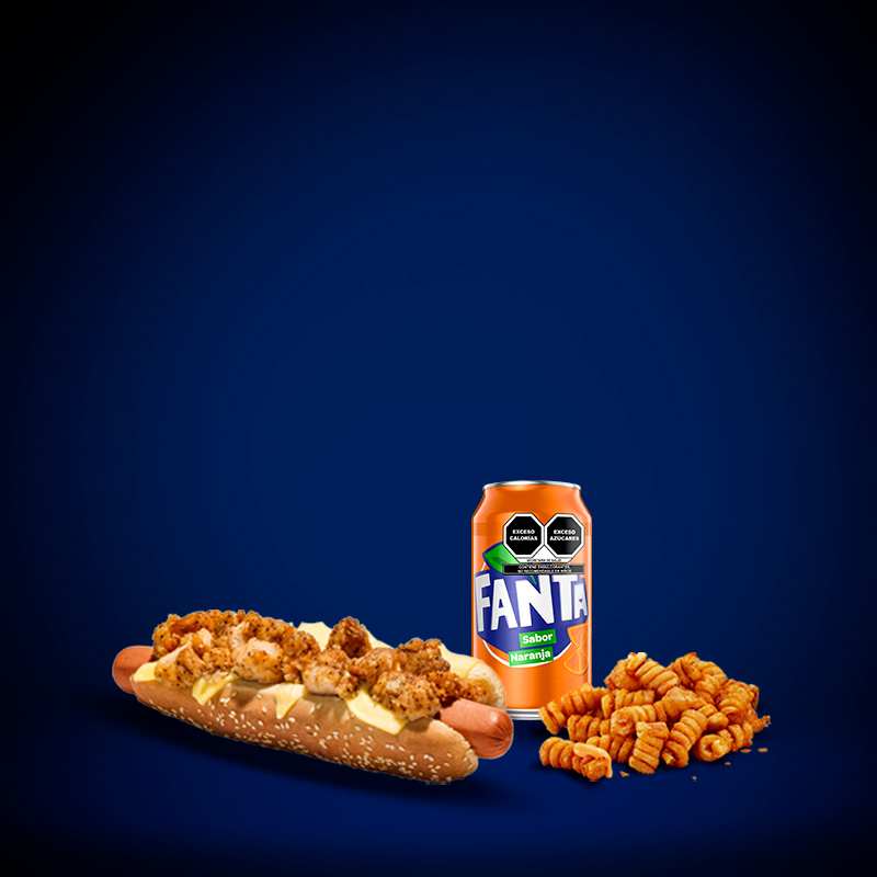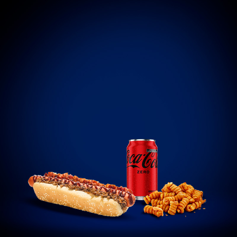Delicioso Hot Dog con queso cheddar y trozos de tocino, acompañado por papas Twister y una porción de boneless con salsa de tu elección + 1 Bebida de la familia Coca-Cola®.