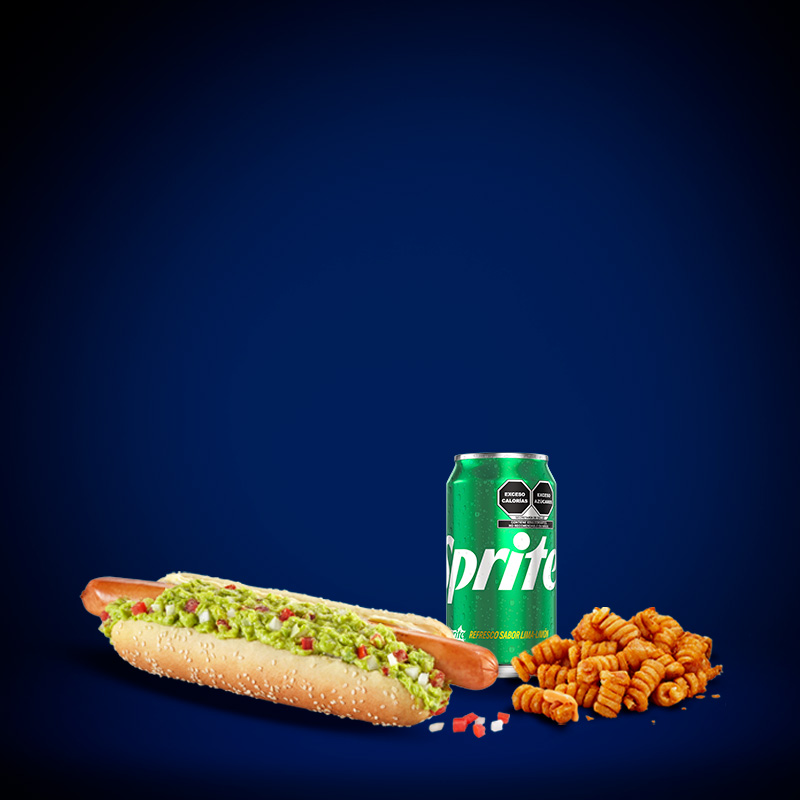 Nuestro Hot Dog Tradicional con guacamole y pico de gallo, acompañado de Papas Twister + 1 Bebida de la familia Coca-Cola®.