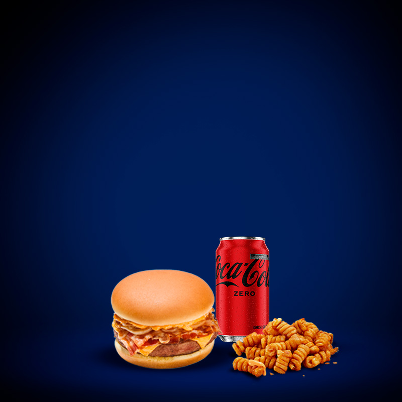 Hamburguesa con queso cheddar, tocino, carne de la marca Certified Angus Beef®, cebolla caramelizada y aderezo; acompañada de una orden de Papas Twister (150g aprox) con un chile toreado + 1 Bebida de la familia Coca-Cola®.