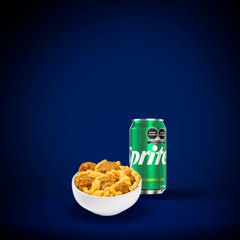 Boneless de pollo, mezclados con macarrones bañados en salsa de queso cheddar (200 g aprox.) acompañados con salsa o aderezo de tu preferencia + 1 Bebida de la familia Coca-Cola®.