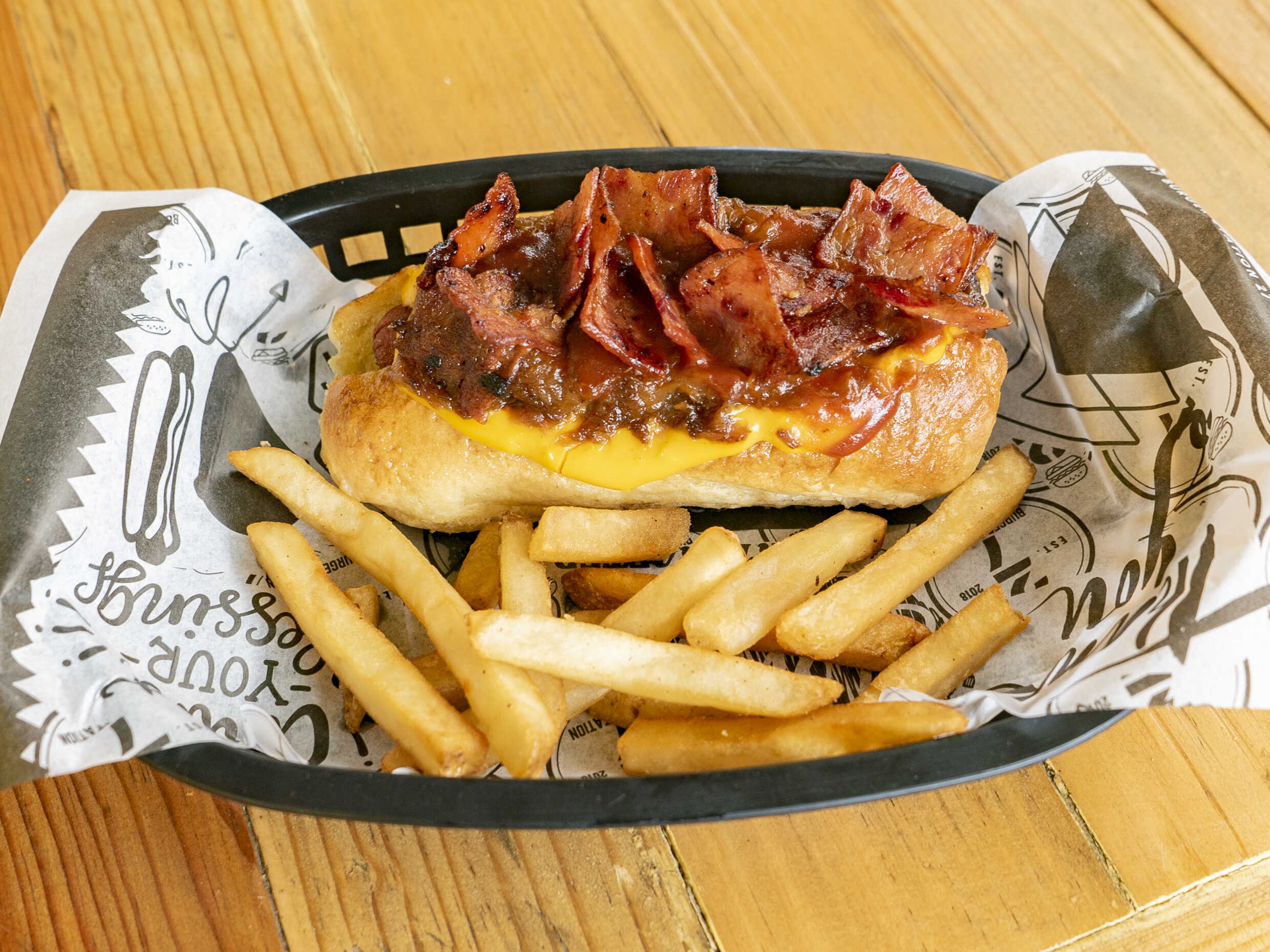 Salchicha de pavo, tocino crujiente, cebolla caramelizada, salsa BBQ y queso cheddar. Incluye papas a la francesa.