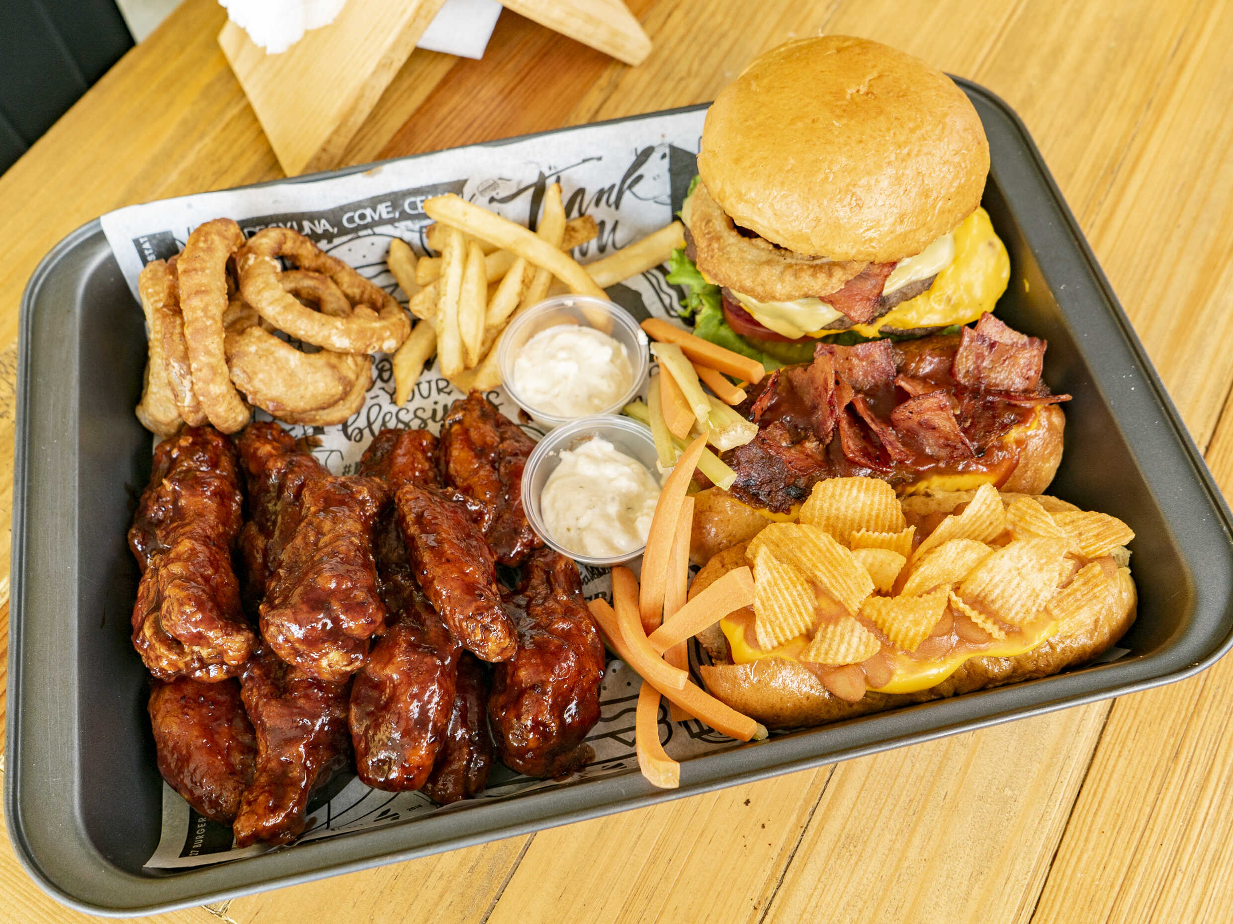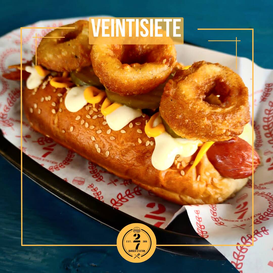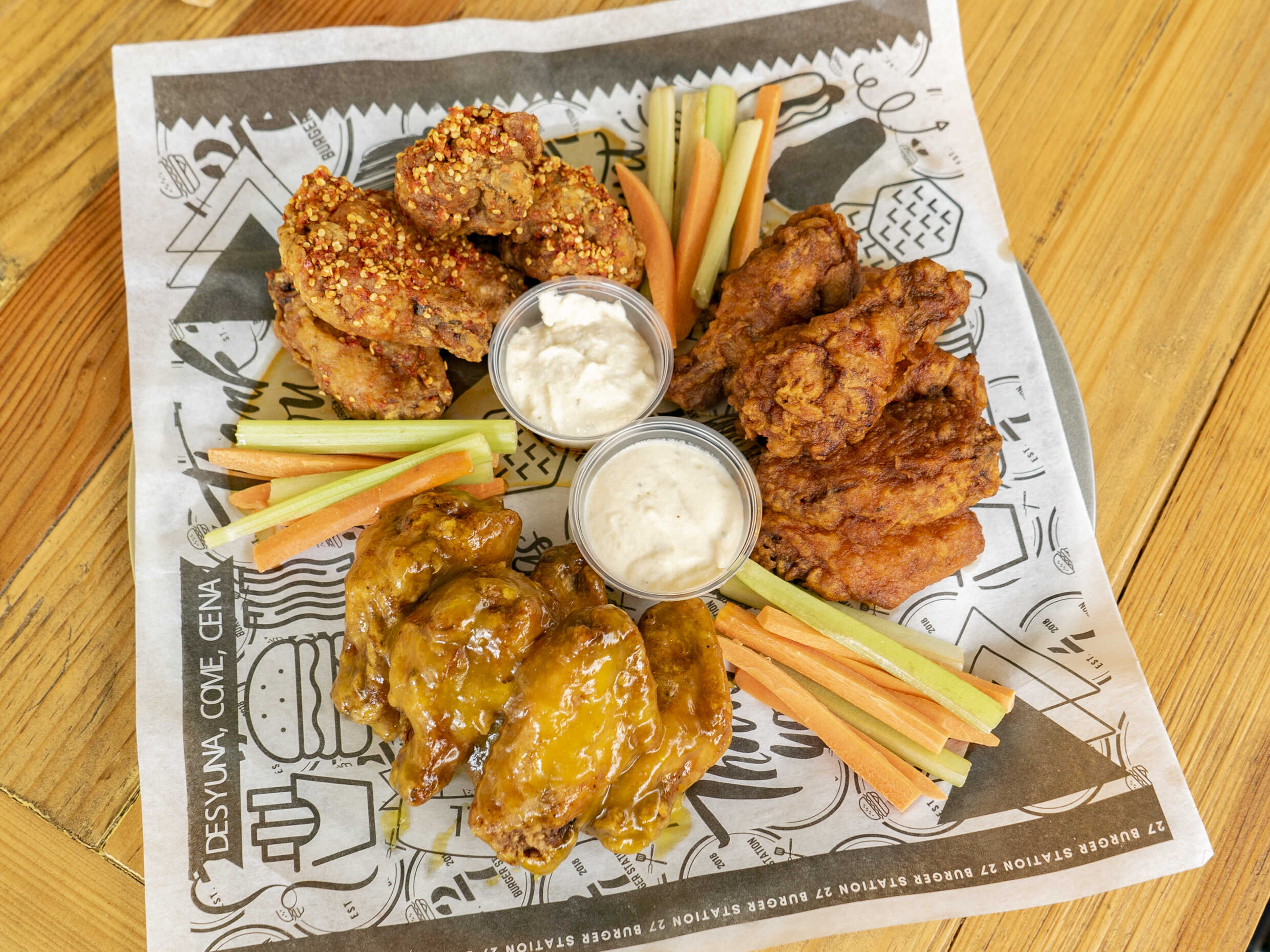 Incluye 12 alitas, 1 hamburguesa 27, 2 hot-dogs a elegir, 1 orden de papas a la francesa y 1 orden de aros.