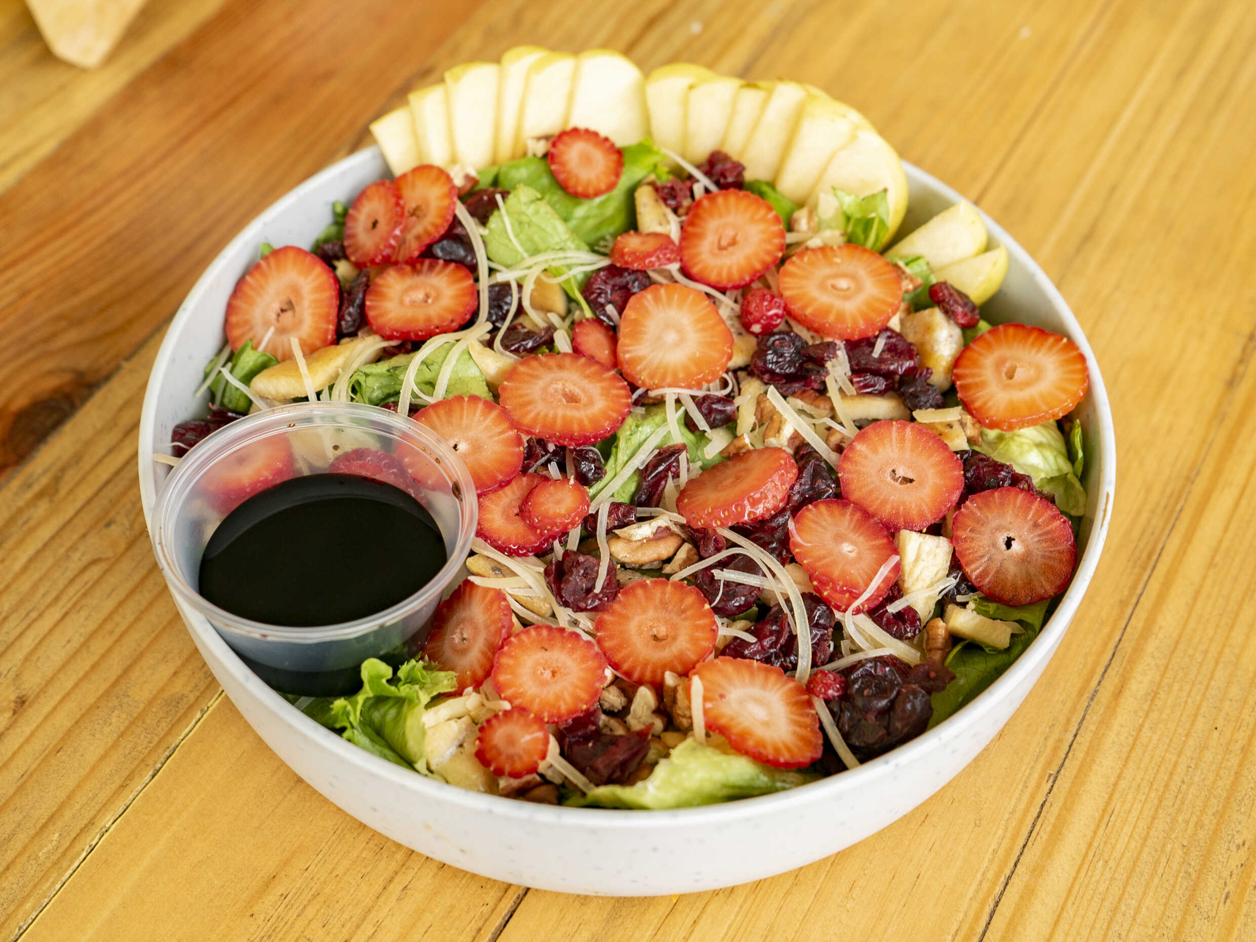 Mita de nuestra sweet salad con pechuguita de pollo asada, lechugas, manzana, arándanos, fresas y nueces.