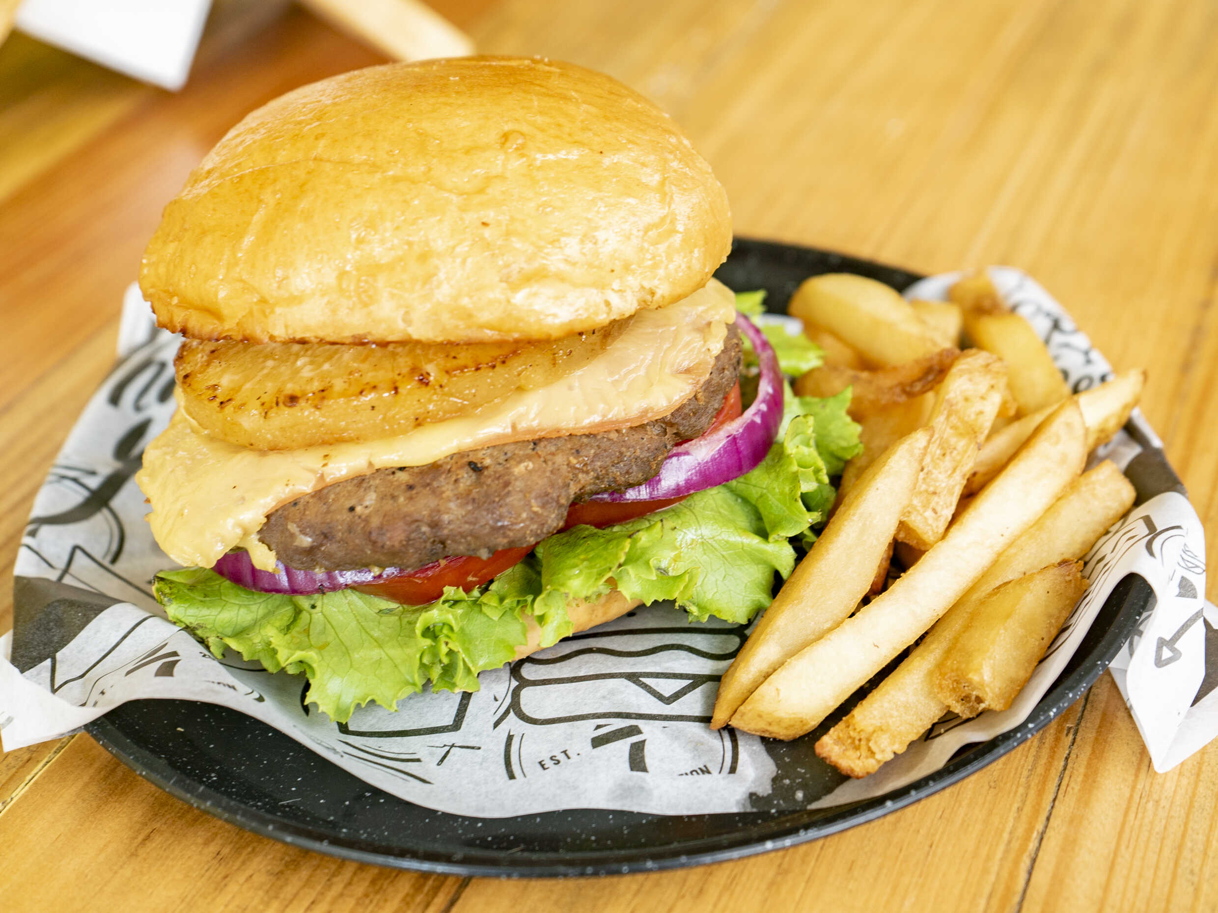 Carne angus beef de 170 gramos, piña y jamón a la plancha, queso gouda derretido y vegetales. Incluye papas a la francesa.