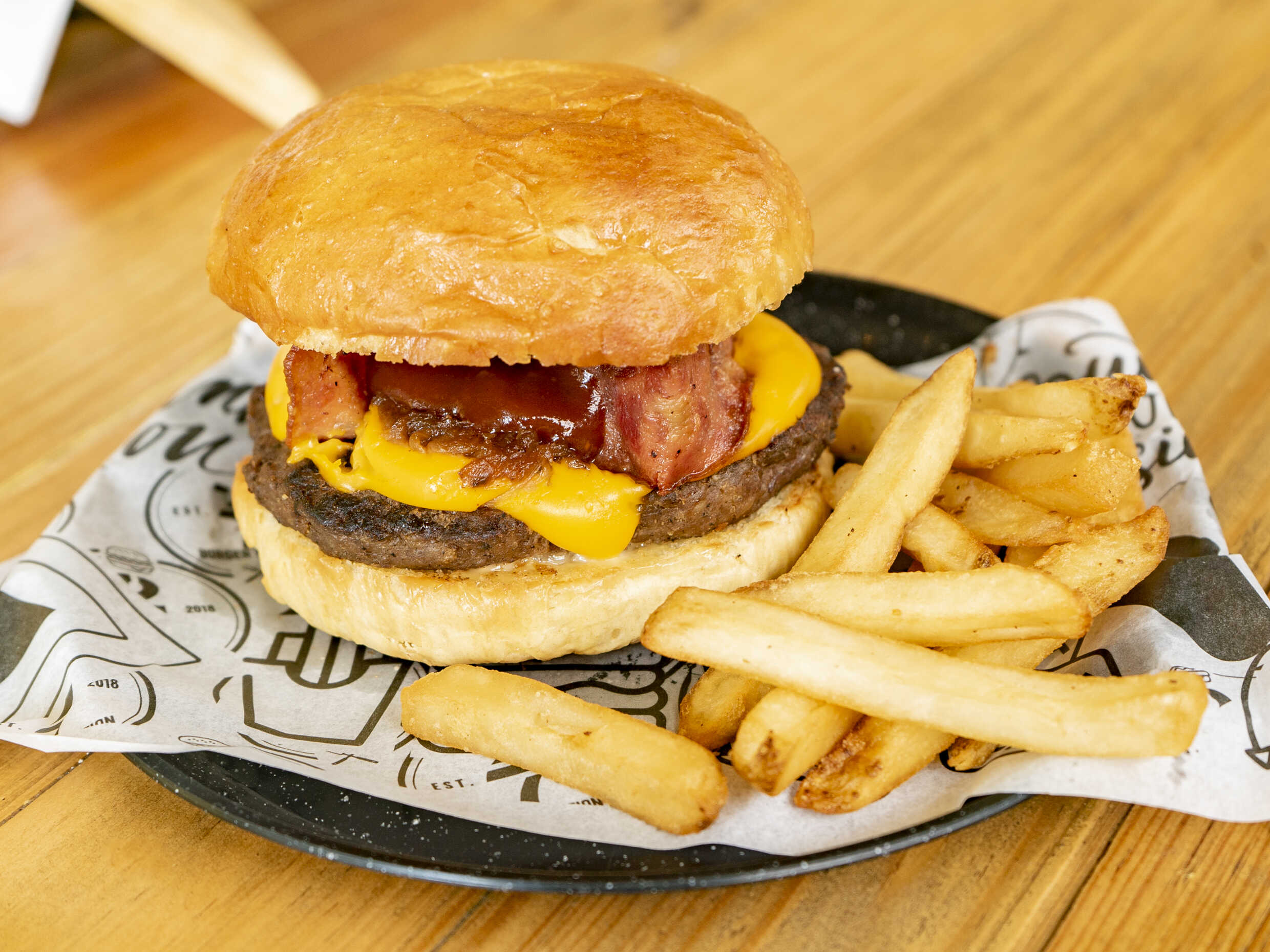 Carne angus beef de 170 gramos, tocino crujiente, cebolla caramelizada, salsa BBQ y queso cheddar. Incluye papas a la francesa.