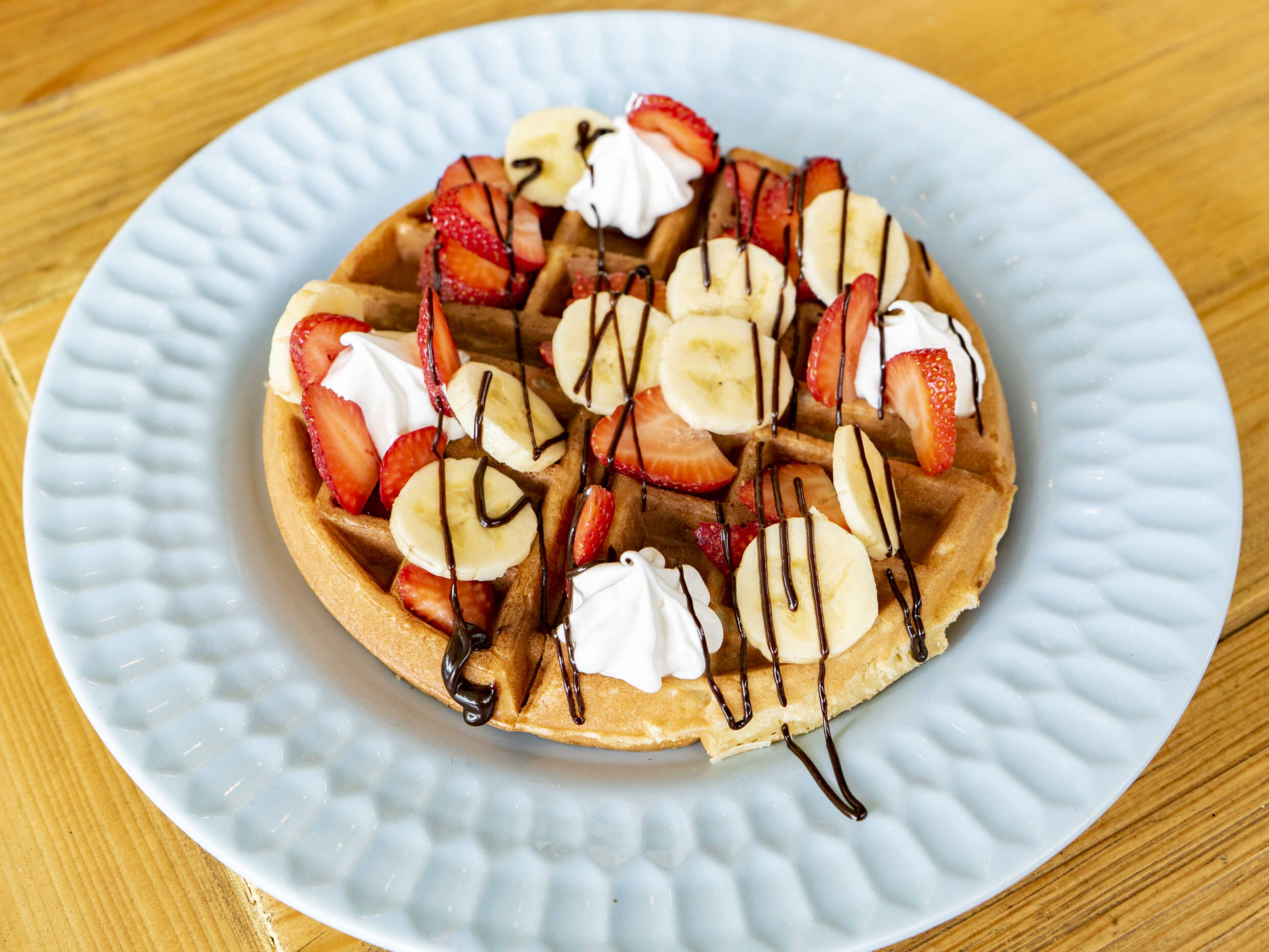 Incluye 3 piezas de hot-cakes o un waffle con miel, tocino y un huevito.