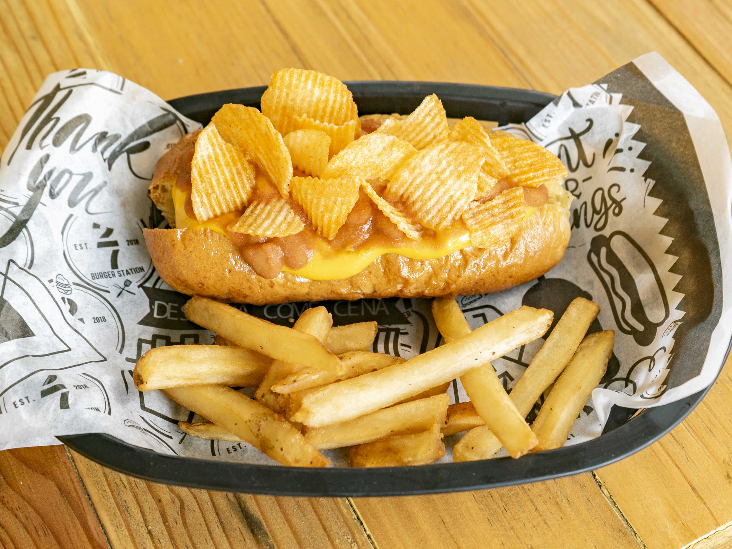 Salchicha de pavo, queso cheddar derretido, pepinillos y vegetales. Incluye papas a la francesa.