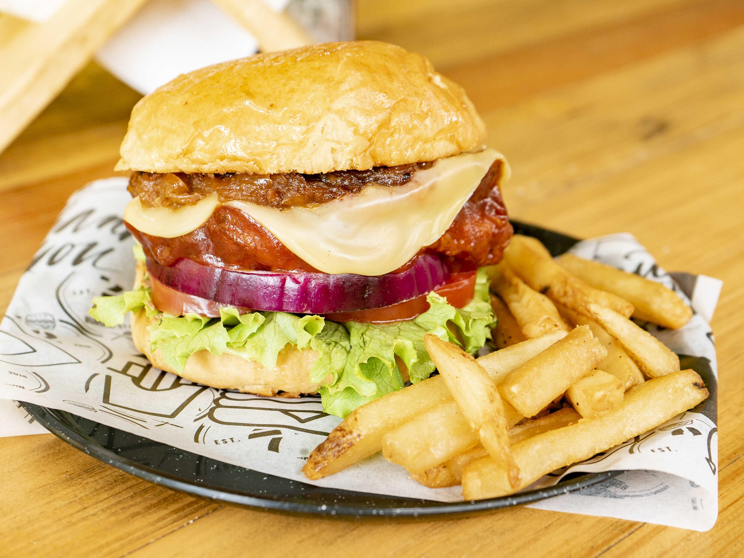 Jugosa pechuga de pollo frita y bañada en salsa BBQ, queso gouda derretido, cebolla caramelizada y vegetales.