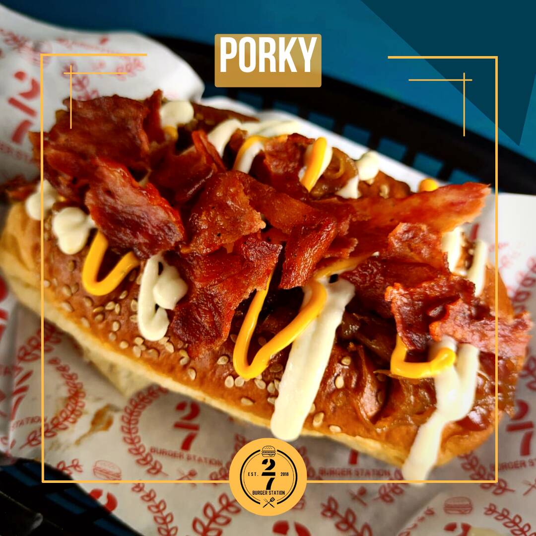 Salchicha polaca, quesos cheddar y gouda fundidos, tocino, aros de cebolla y pepinillos. Incluye papas a la francesa.