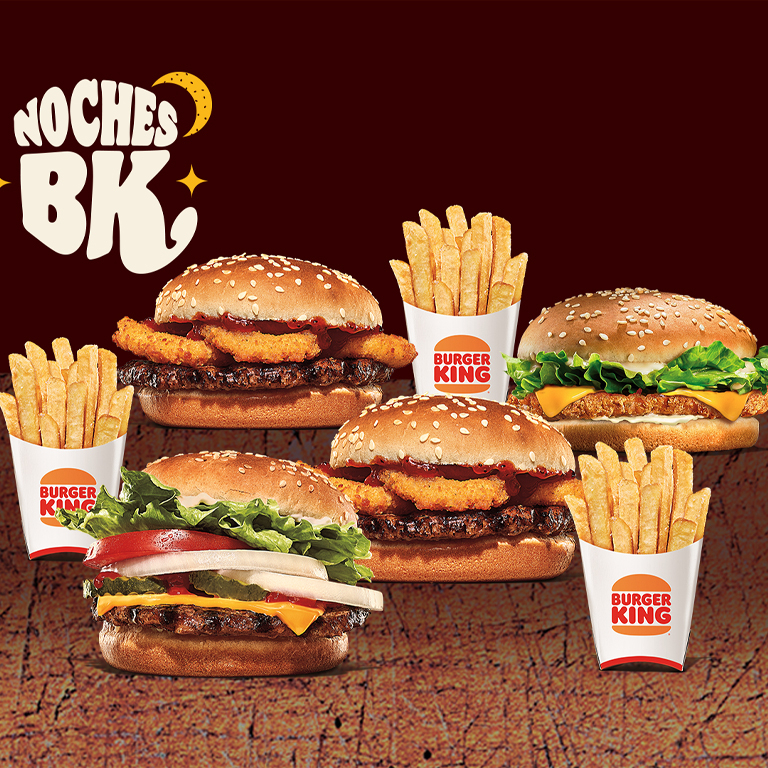 Las noches del Rey son para compartir con: 2 Rodeo Burger + 1 Whopper® Jr con queso + 1 Crispy Chicken + 3 papas chicas.