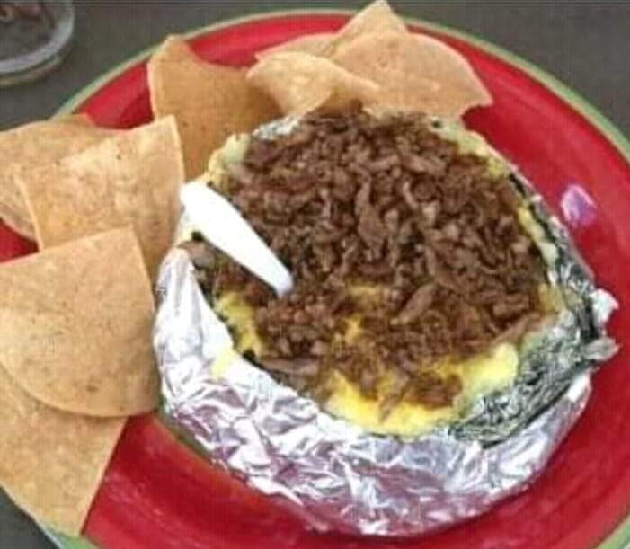 Carne al pastor con queso y 6 tortillas fritas.