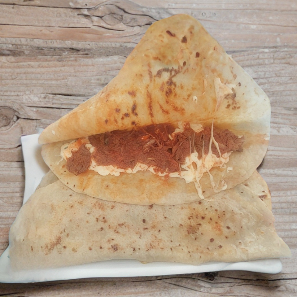 Tortilla de harina artesanal con queso y chistorra asada.