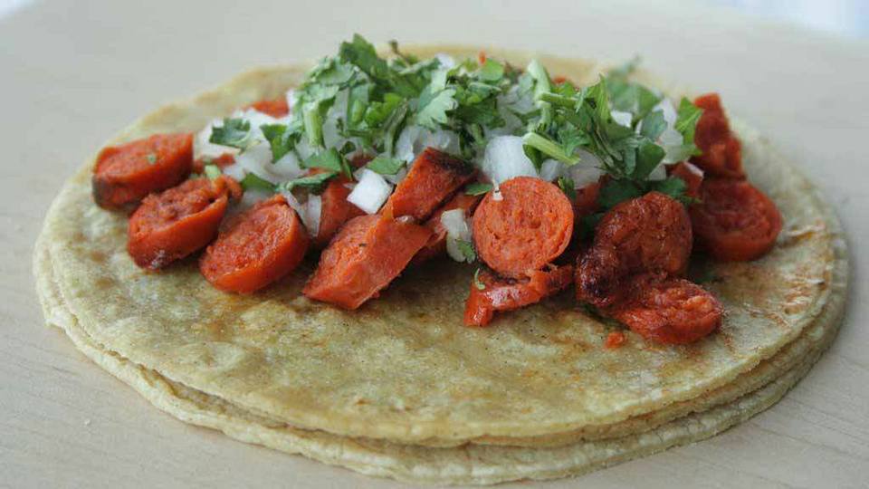Tortilla de maíz con queso y chistorra asada.