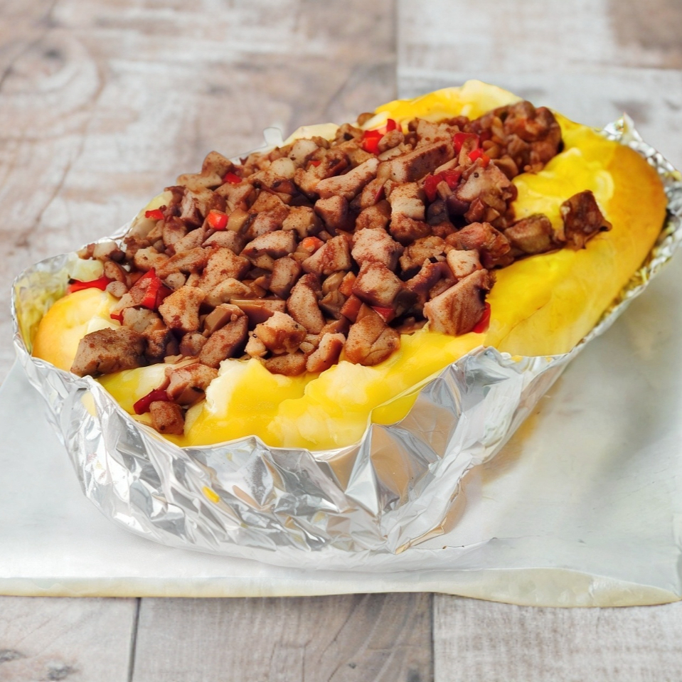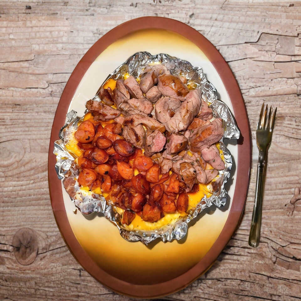 Papa 3 quesos con arrachera y chistorra.