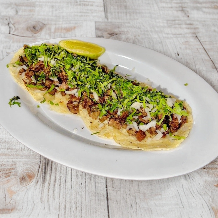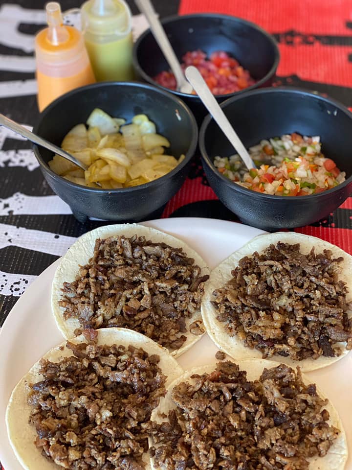 Arrachera asada, 25 tortillas de maíz, chiles toreados, cebollas asadas, verduras