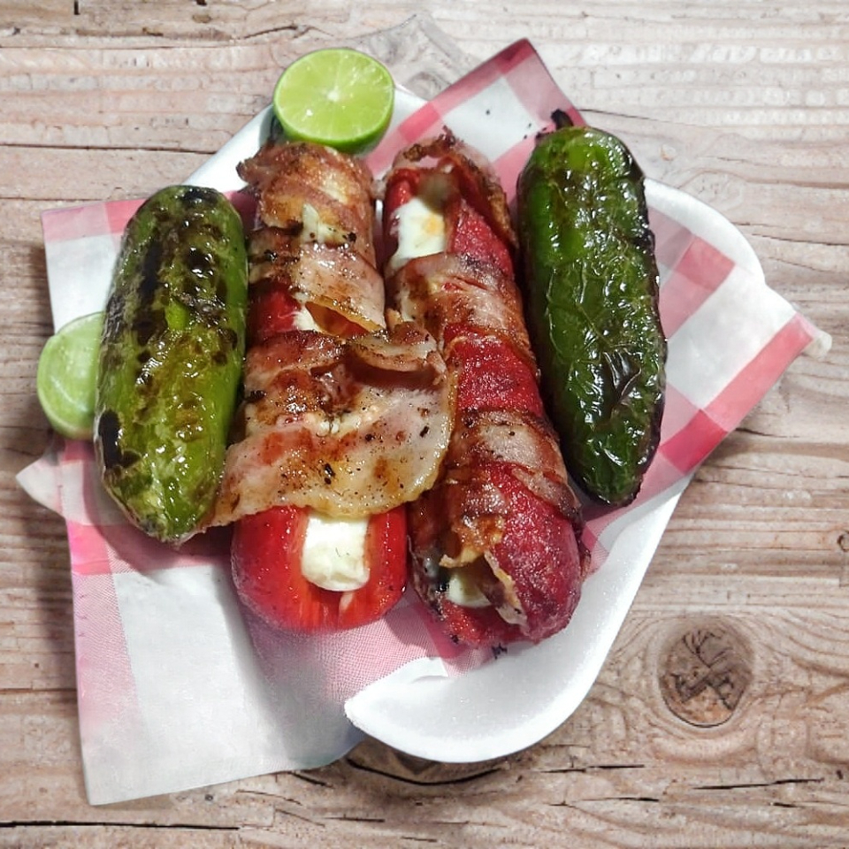 Diezmillo asado, 13 tortillas de maíz, chiles toreados, cebollas asadas, verduras