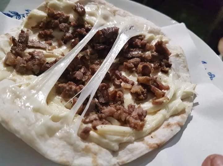 Tortilla frita con carne al pastor y queso.