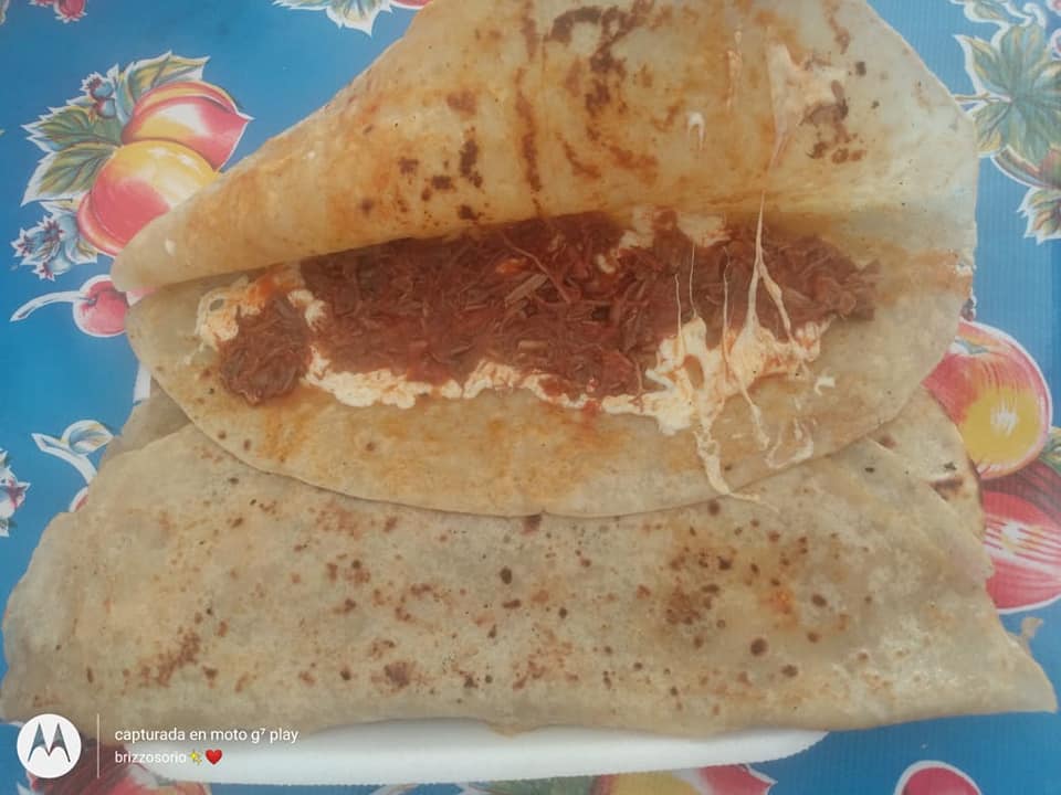 Tortilla con queso y carne de diezmillo asado.