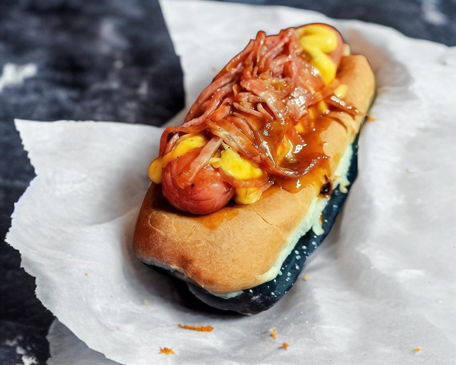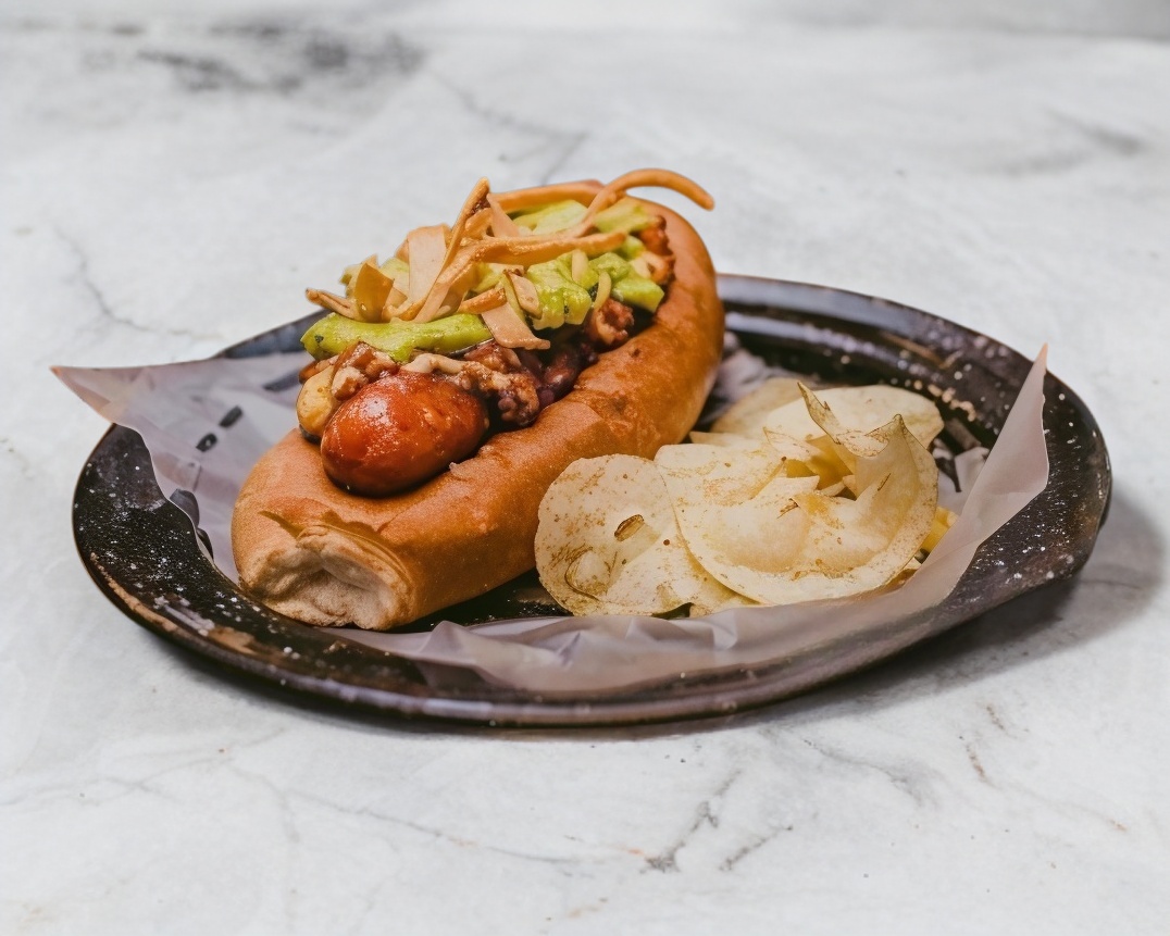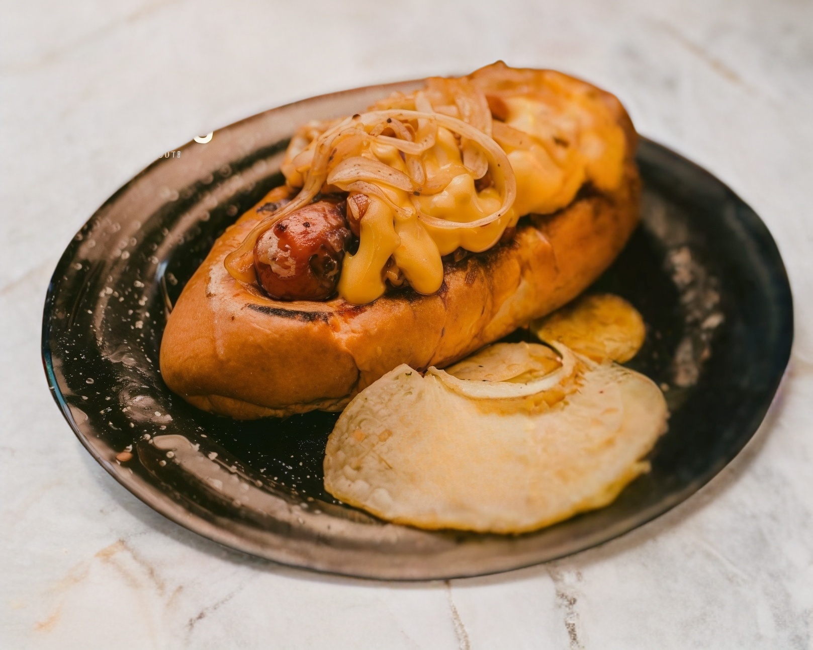Chillidog, queso cheddar y cebollas caramelizadas.