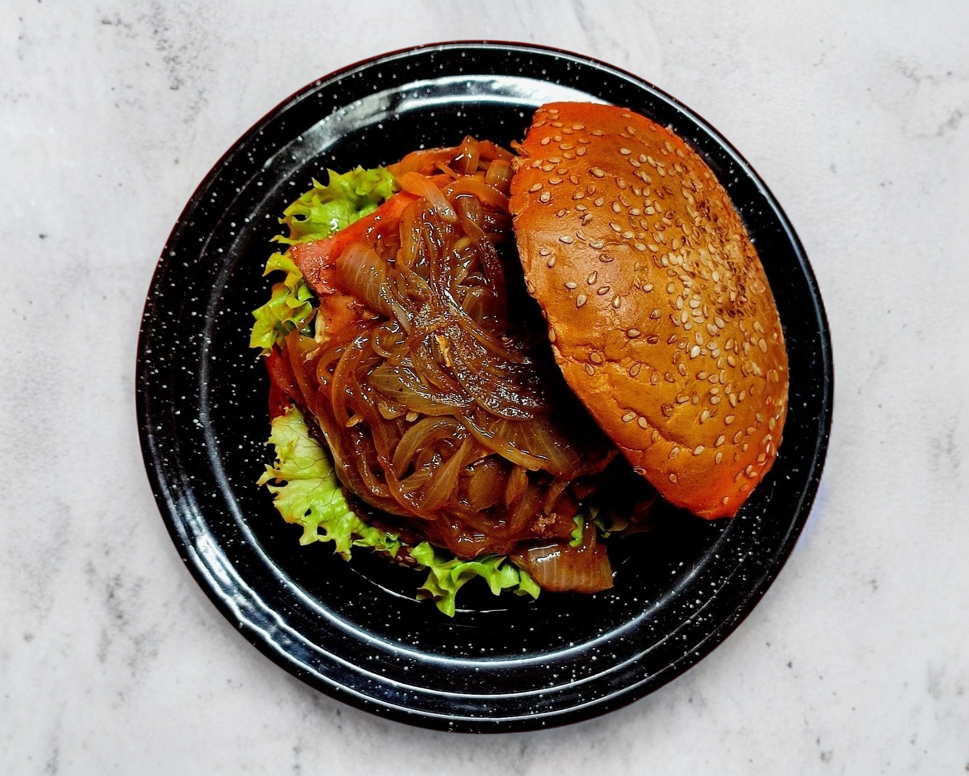 Omelette de queso cheddar, cebollas caramelizadas y tocino crujiente.