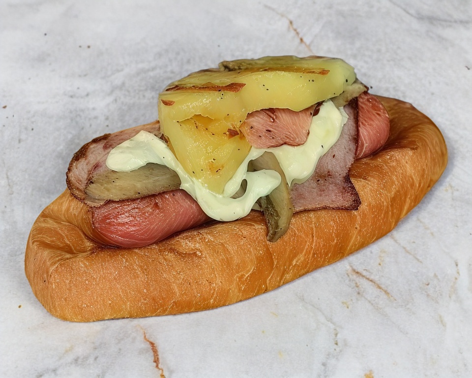 Jamón, queso Oaxaca, huevo estrellado y tocino.