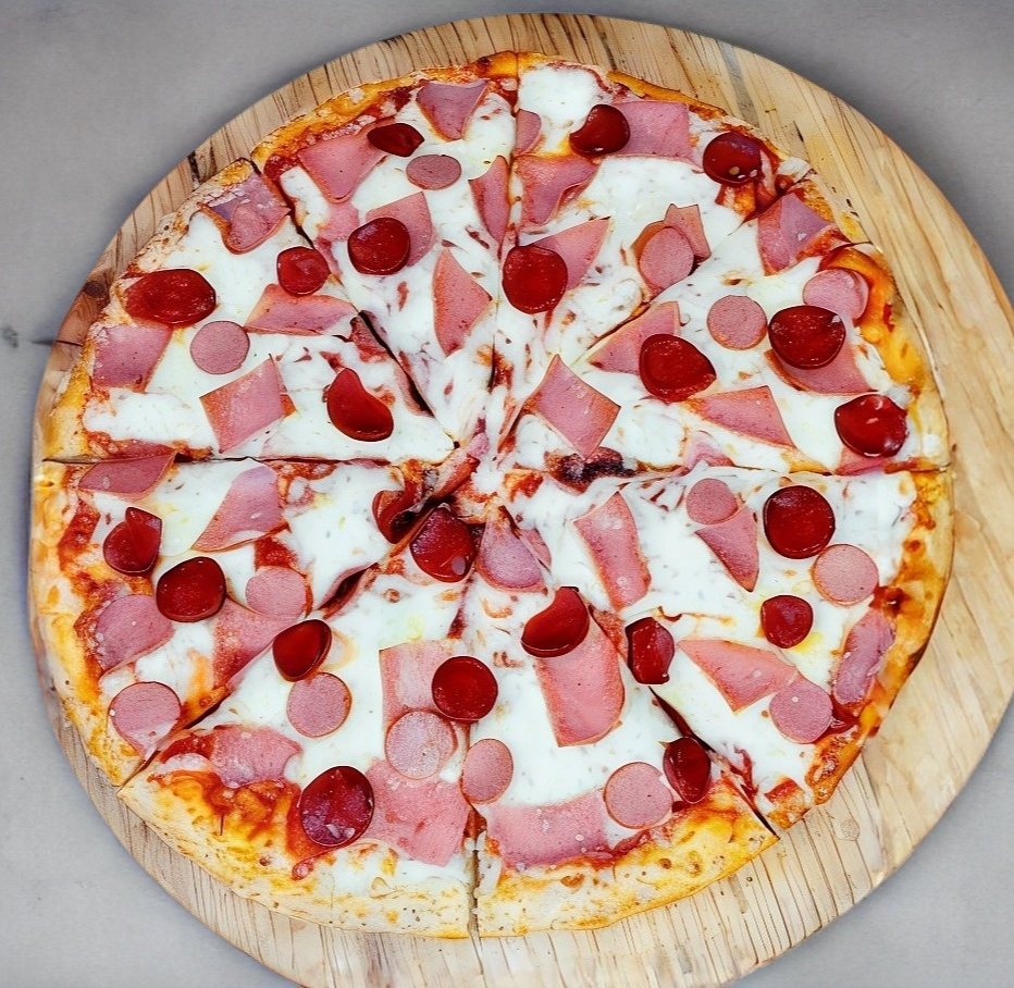 Pizza grande 35 cm, chorizo español, jamón, salchicha.