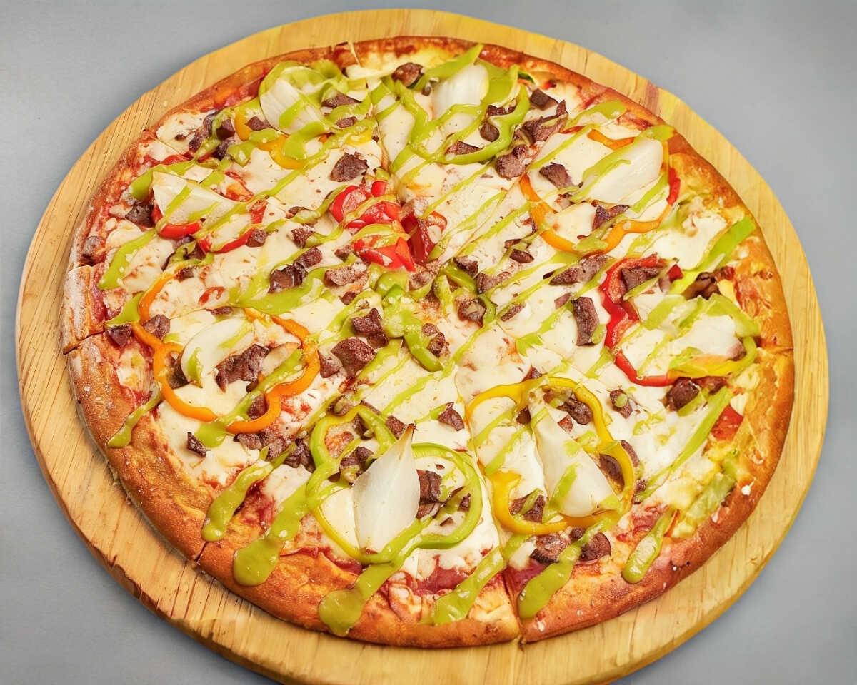 Pizza grande 35 cm, arrachera asada, pimientos, cebolla cambray y guacamole.