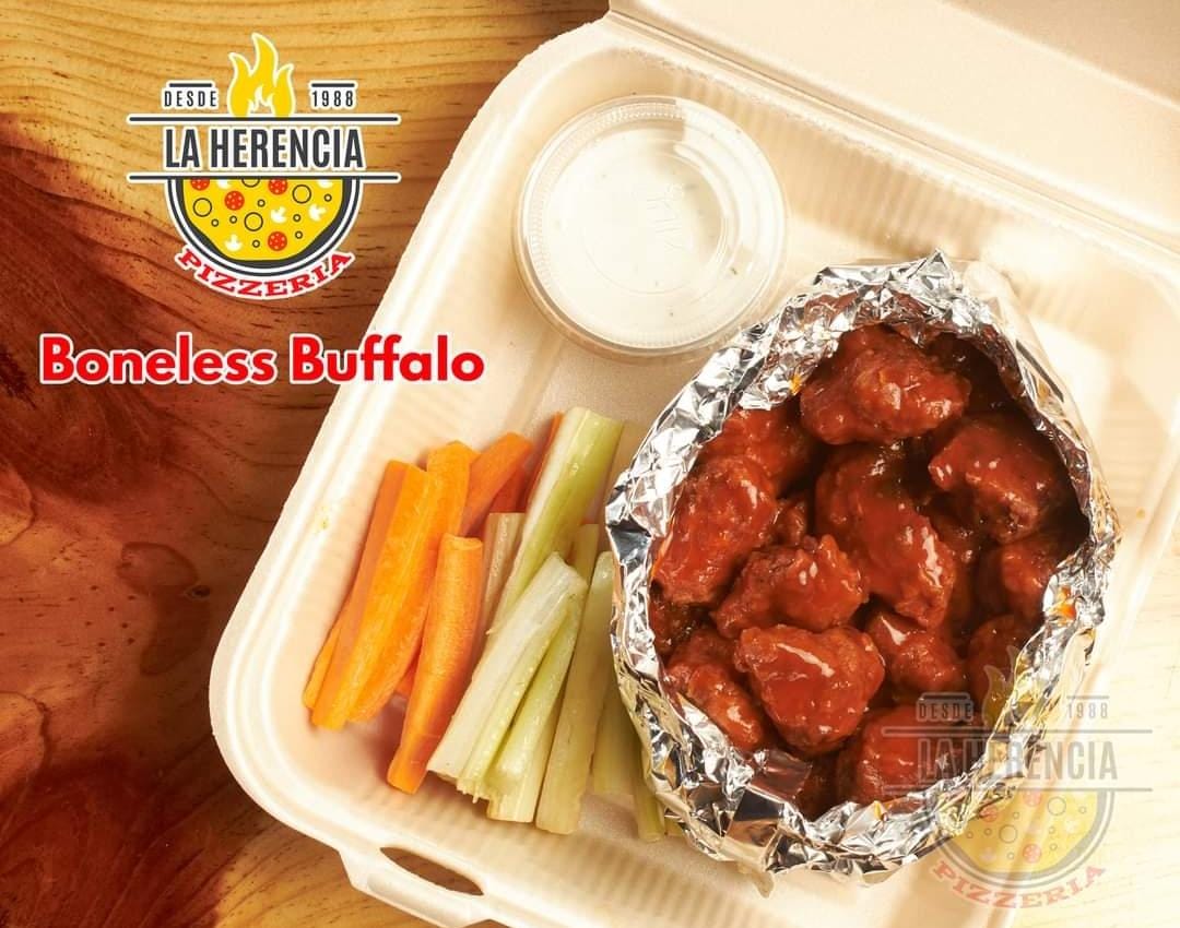 Pizza grande 35 cm, bonneles de pollo, bañados en salsa buffalo, apio y aderezo ranch.