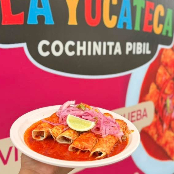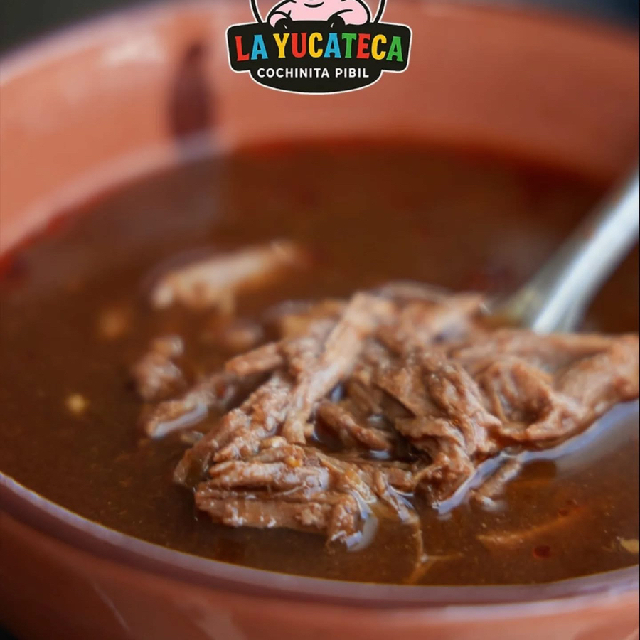 Bu Torta de cochinita con cebolla encurtida y salsa, acompañada de su consomé de cochinita