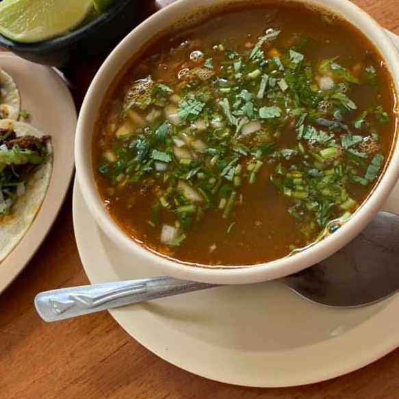 Consomé acompañado de tortillas cebolla cilantro y salsas