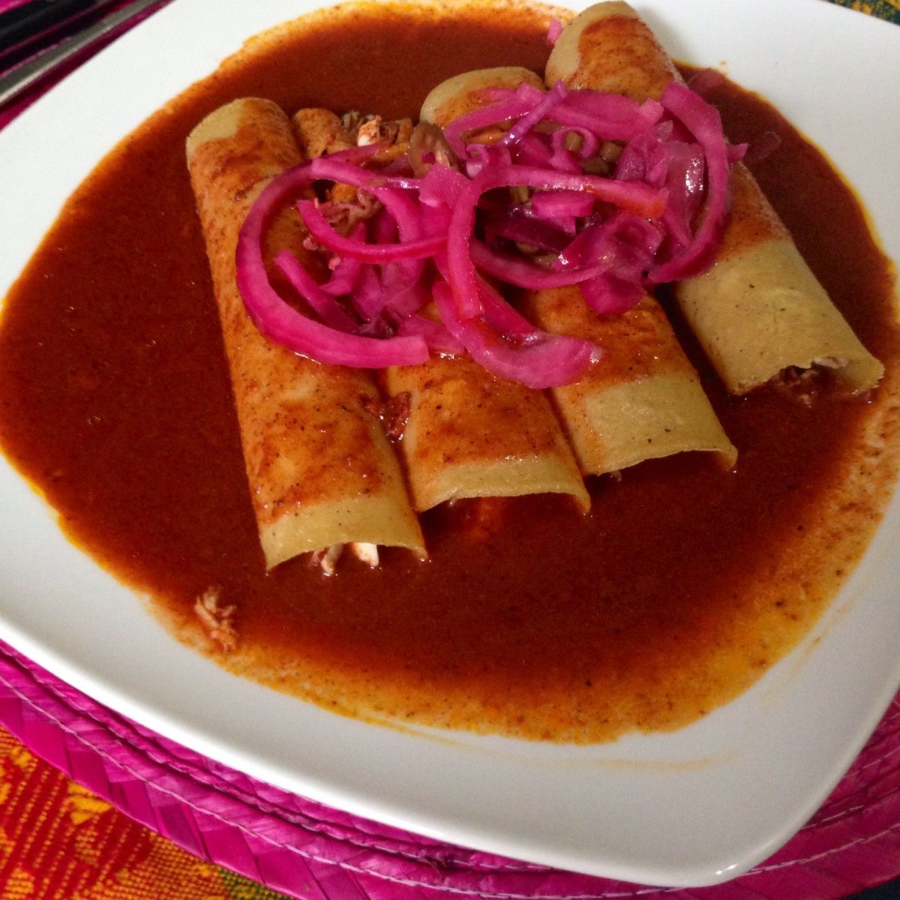Cochinita acompañado de salsa cebollitas tortillas y tostadas