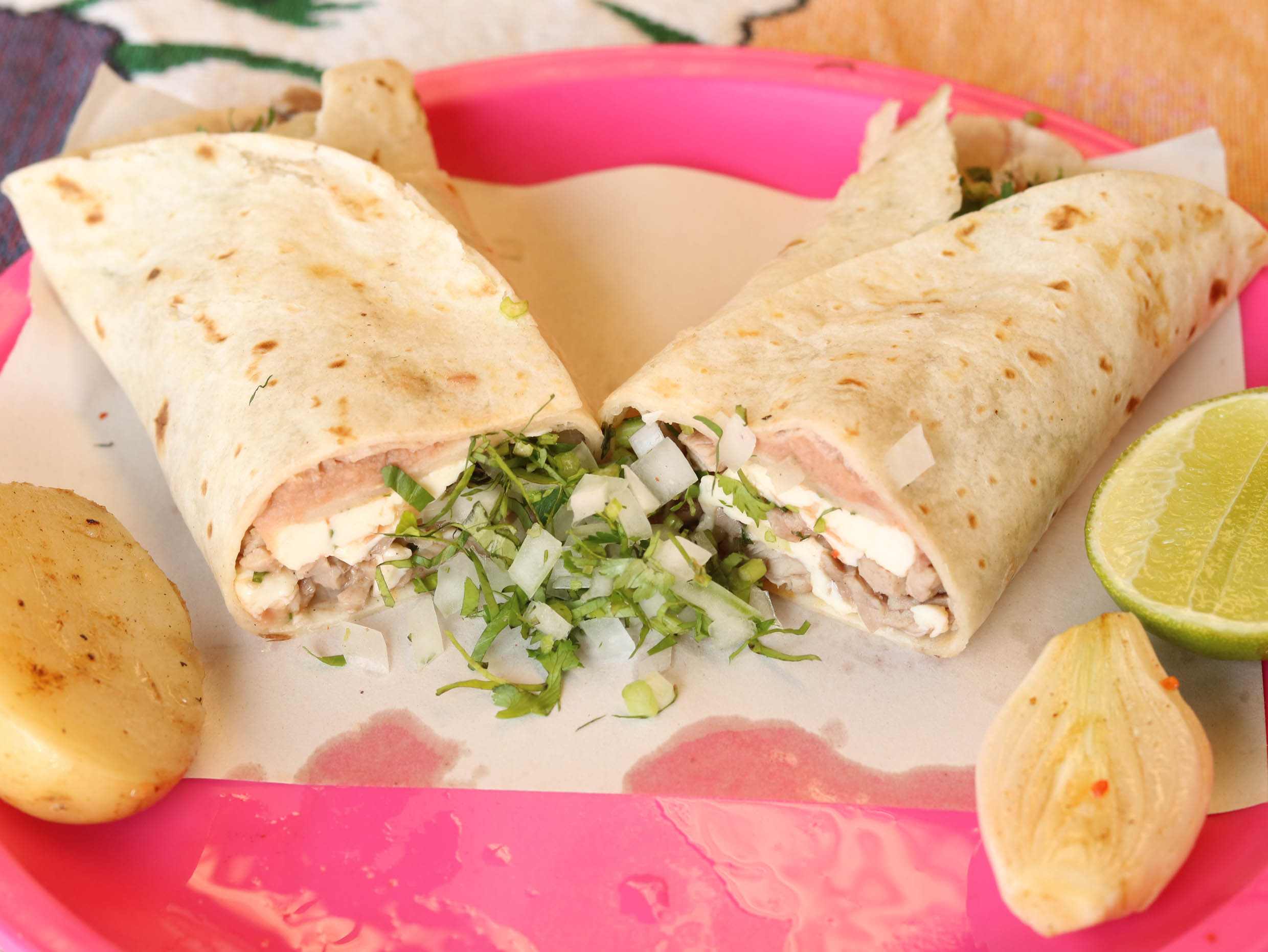 Tortilla de harina grande, frijoles refritos, queso, cilantro, cebolla y chorizo.