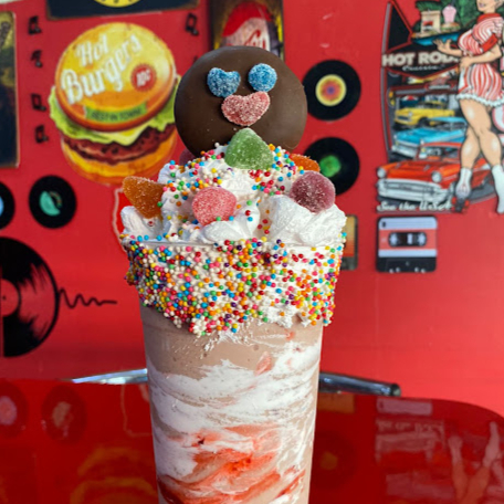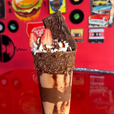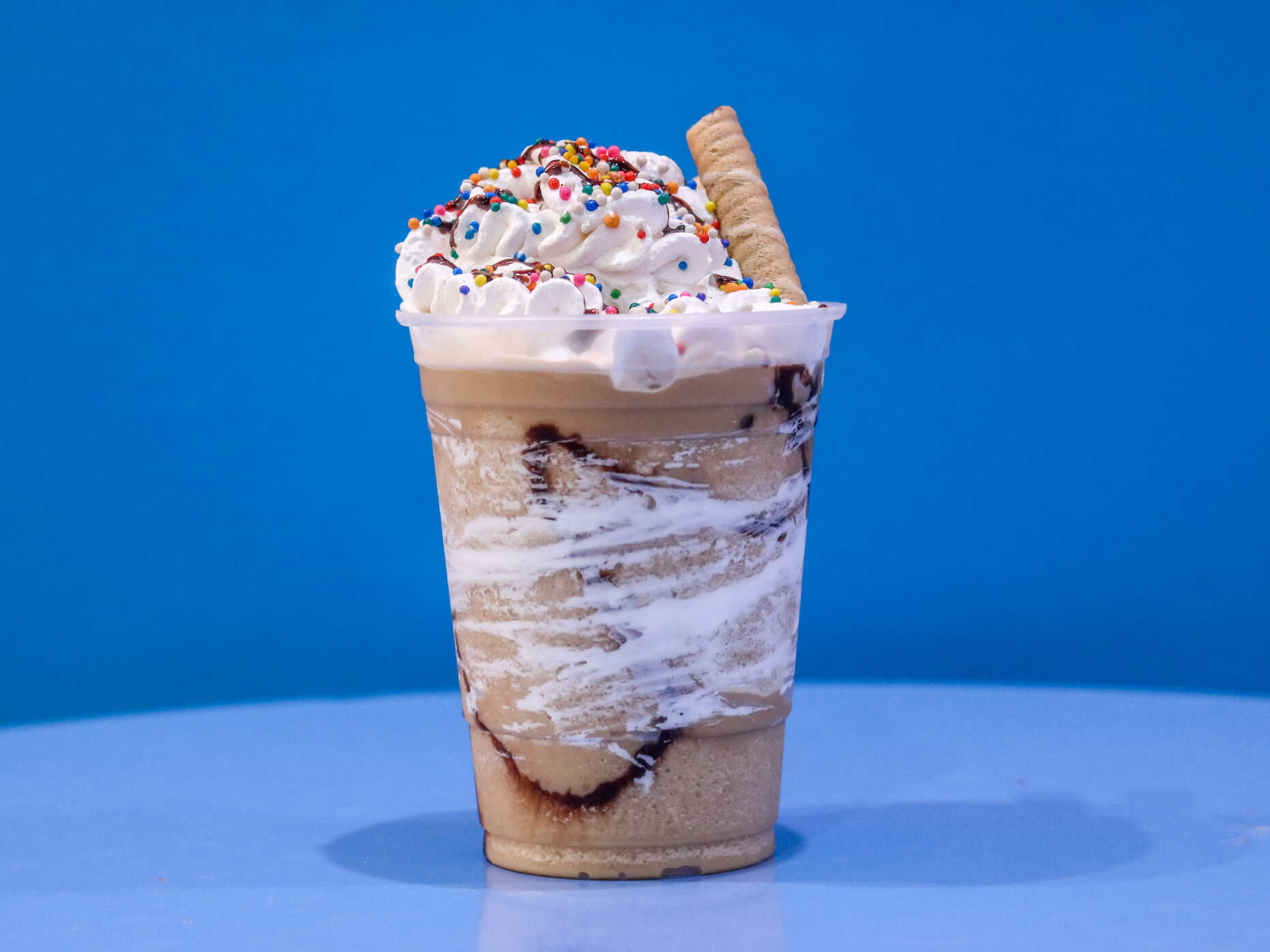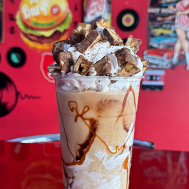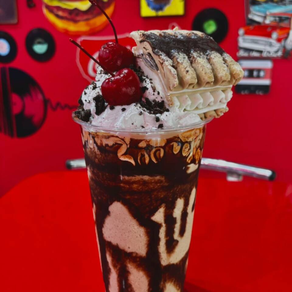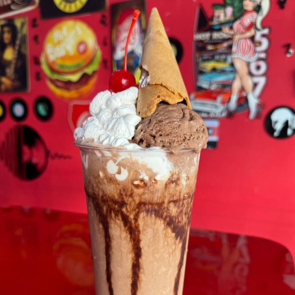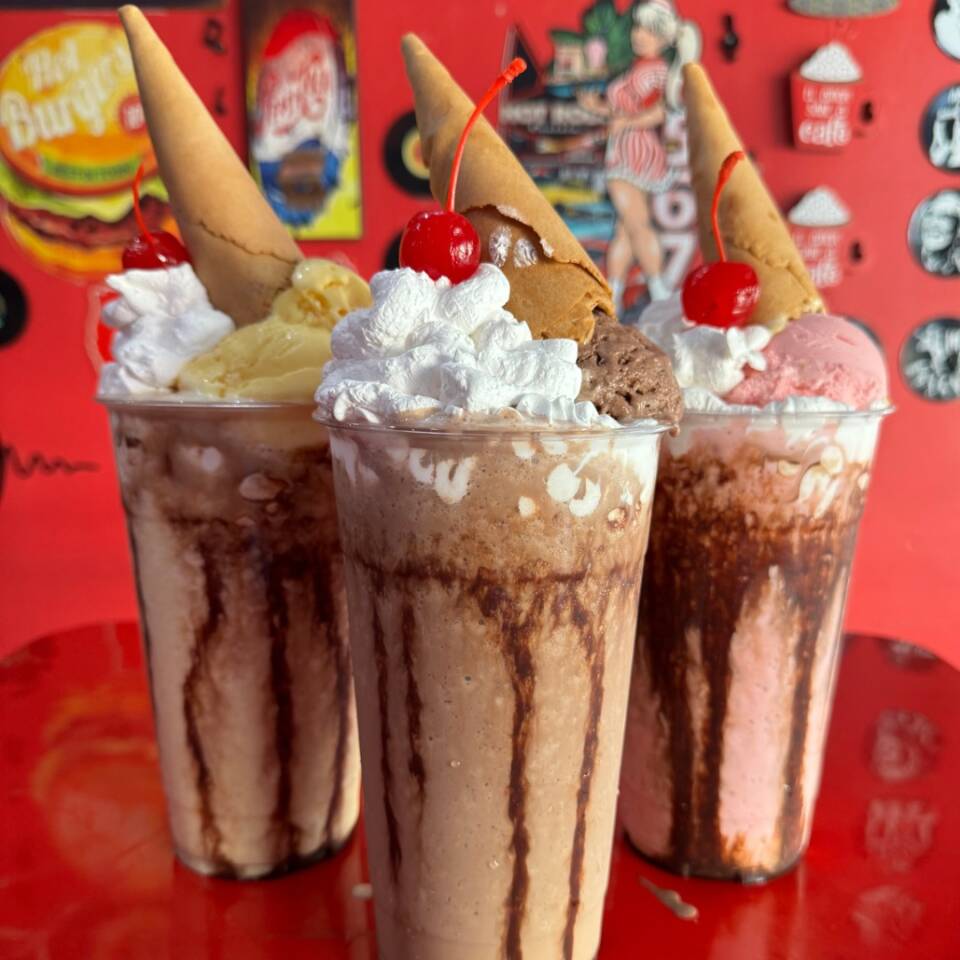 Malteada de 16 onzas a base de helado (sabor a escoger) acompañada de crema batida, bola de helado, granillo, cereza y cono de helado para acompañar