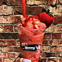 Chamoyada consistencia frapeada a base de fruta natural, acompañada de fruta natural en trozos y una paleta Solero