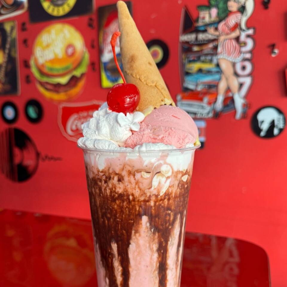 Malteada a base de helado sabor fresa, crema batida, bola de helado, cono y cereza para acompañar